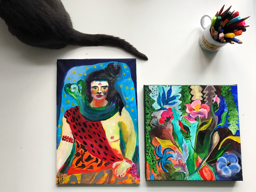 А это творческие результаты дня — два небольших холста и один большой хвост.