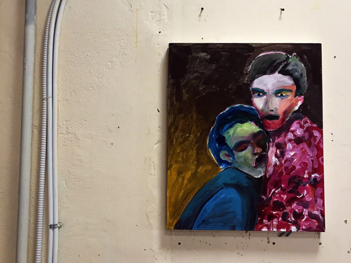 При этом у меня пару недель назад родилась мысль написать парный мужской портрет. Это было вызвано небольшим инцидентом, который случился в мастерской. Я стала свидетелем того, как Д. поругалась с охранниками на проходной, был жуткий скандал, кончилось всё тем, что она потребовала их назвать свои фамилии, чтобы написать жалобу. Фамилии эти оказались очень нарядными, да и сами дядечки тоже были колоритные, вот я и подумала, что из них получится неплохой холст. Но выглядеть он должен был иначе, вернее, я вообще ещё не придумала, как он мог бы выглядеть. Но сегодня, когда внезапно случилась такая пара, я подумала, что они намного больше подходят под название «Некрасов и Зимин», чем реальные Некрасов и Зимин. Поэтому холст сразу получил название, что, как вы знаете, случается крайне редко, обычно они у меня все носят гордое имя «Untitled».