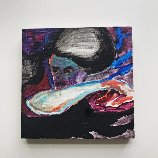 Правда, на Винзаводе меня ждал облом — магнитный ключ не сработал, а мысль о том, чтобы зайти к охранникам и попросить их открыть, мне в голову не пришла. Поэтому я не придумала ничего лучше, чем уехать домой. Учитывая, сколько часов к этому моменту я уже бодрствовала (читай — потратила зря), я решила сделать хоть что-то полезное и порисовала дома — впервые с момента попадания в Открытые студии! Вообще-то, я все материалы перевезла, но пара баночек акрила и старые кисти в доме у художника найдутся всегда. Так что никаких отговорок. Очень быстро сделала два холста — один маленький, 20х20 см, вот он. Второй побольше — 40х50 см, но его я вам не покажу.