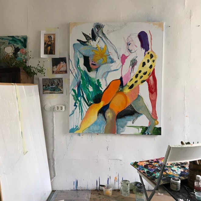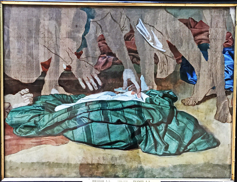 Так вот, ещё пару слов о моей законченной незаконченной картине. Она тоже входит в серию, которую я пока условно называю «Друг музея», и тоже получилась в результате диалога с картинами из Третьяковки. На этот раз метод был немного другой — пока я работала, у меня перед глазами было 3 изображения: женский портрет Репина с его недавней выставки на Лаврушинском и два эскиза Иванова. Но я их использовала не буквально, а просто, что называется, вприглядку (это слово из лексикона моей бабушки, она рассказывала, что во время войны, когда вообще ничего не было, чай с сахаром был непозволительной роскошью, и если в доме был хоть один кусочек сахара, то он лежал на столе, как сокровище, и все пили чай, глядя на него и представляя, что он в стакане — это называлось чаепитием вприглядку).