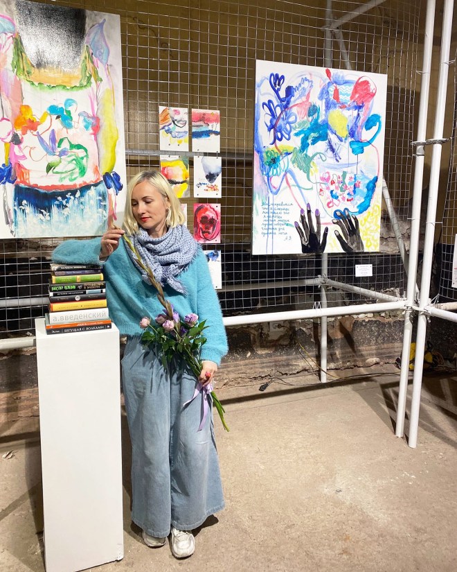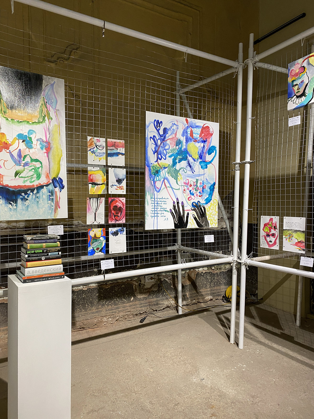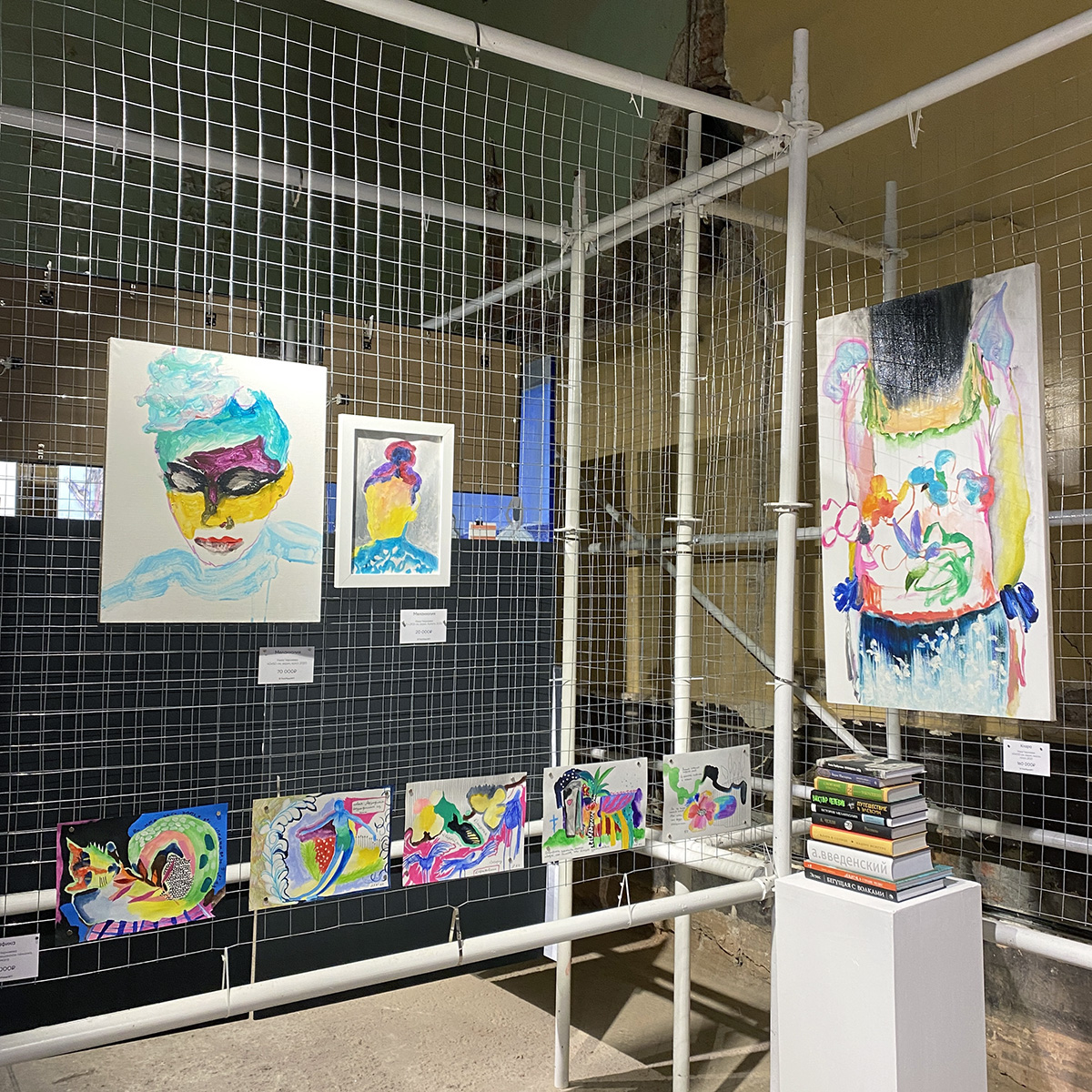И стендом своим я была очень довольна — получилось сделать скорее выставочную развеску, нежели коммерческую (что не помешало нам продать несколько работ). Из предложенных концепций К. выбрала ту, которая связана с книгами (и я её в этом выборе категорически поддержала). В итоге все холсты и графика были так или иначе связаны с текстами, которые мы тоже представили — на подиуме в центре стенда лежала стопка литературных первоисточников. По задумке, покупателям работ полагалась в подарок книга, благодаря которой приобретённая ими работа появилась на свет.