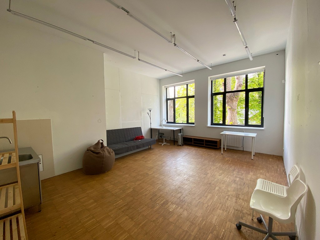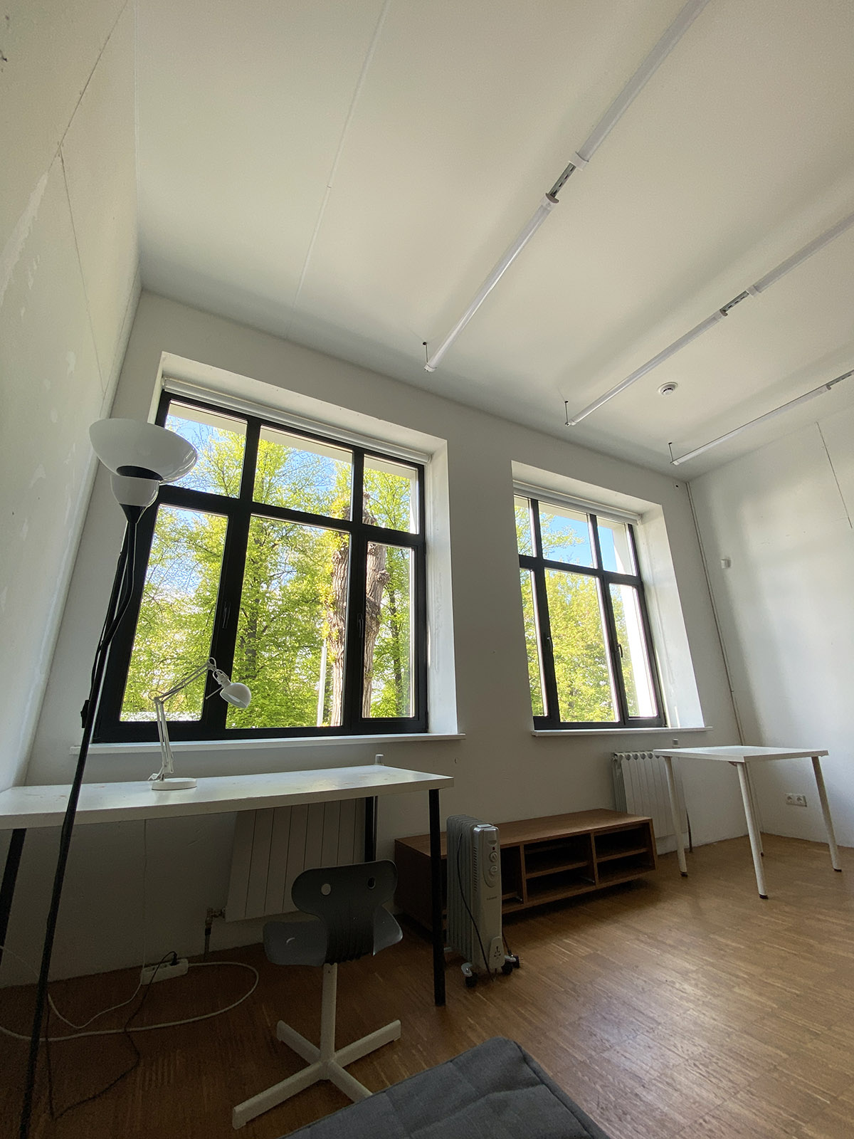 Полноценная работа ещё не началась, мою комнату должны немного обновить после предыдущего резидента, перекрасить стены в белый, и холсты ещё некуда прибивать.
