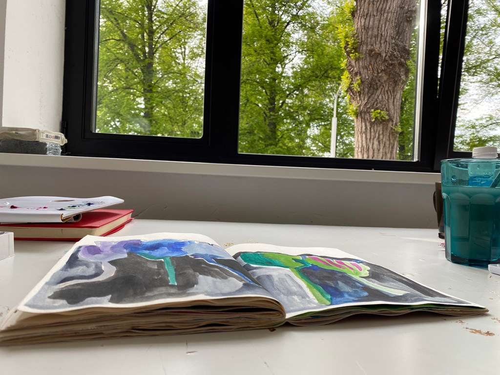 Вчера немного порисовала в скетчбуке, моя мастерская на втором этаже, стол у окна с видом на зелень, просто блеск и плеск, какая красота.